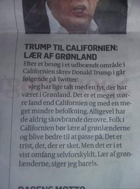 For omkring et par år siden løb billedet herunder som en steppebrand på sociale medier. Det ligner en rigtig artikel fra en avis. Artiklen tager nemlig udgangspunkt i en virkelig hændelse, for på det tidspunkt var der heftige skovbrande i den amerikanske delstat Californien, og slukningsarbejdet gik ikke helt, som det burde. Ifølge artiklen kastede den daværende amerikanske præsident, Donald Trump, et surt budskab af sted: De californiske brandmænd kunne lære noget af grønlænderne, for de har aldrig skovbrande.