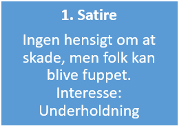 Satire betragter vi som misinformation, for det er i udgangspunktet ikke lavet for at gøre nogen ondt eller sprede falske budskaber. Satirisk indhold er næsten altid let at gennemskue, men der findes også mange eksempler på, at man alligevel kan blive ledt på afveje. Og det kan meget let udløse en shitstorm mod en person eller organisation, fordi det bliver misforstået som en sandhed. Det sker især, når afsenderen enten ikke er kendt for at sprede sjove indslag, eller når indslaget ikke gør opmærksom på, at det hele bare er for sjov.